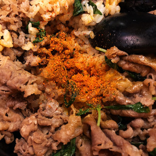 台式新丼,厚鋪一層已調味過的片牛肉,光是牛肉香氣足以誘人,再添加九層塔,台味就此產生;最吸睛的,當然是座落中間的那顆精選蛋黃,每個人都在等待破壞薄膜後的金黃液體,如何竄流在顆顆飯粒間。